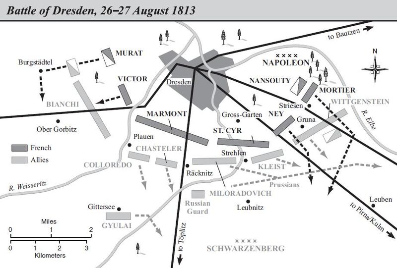 Napoleon continued to advance for another day, but then received a message from Marshal Laurent St Cyr warning him that Dresden was threatened by Prince Karl Philip zu Schwarzenberg’s Army of Bohemia. Napoleon saw an opportunity to defeat the Army of Bohemia, the largest of the three Coalition armies in Central Europe: the other was Bernadotte’s Army of Northern Germany.