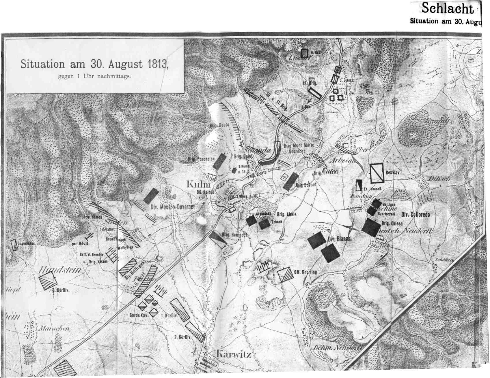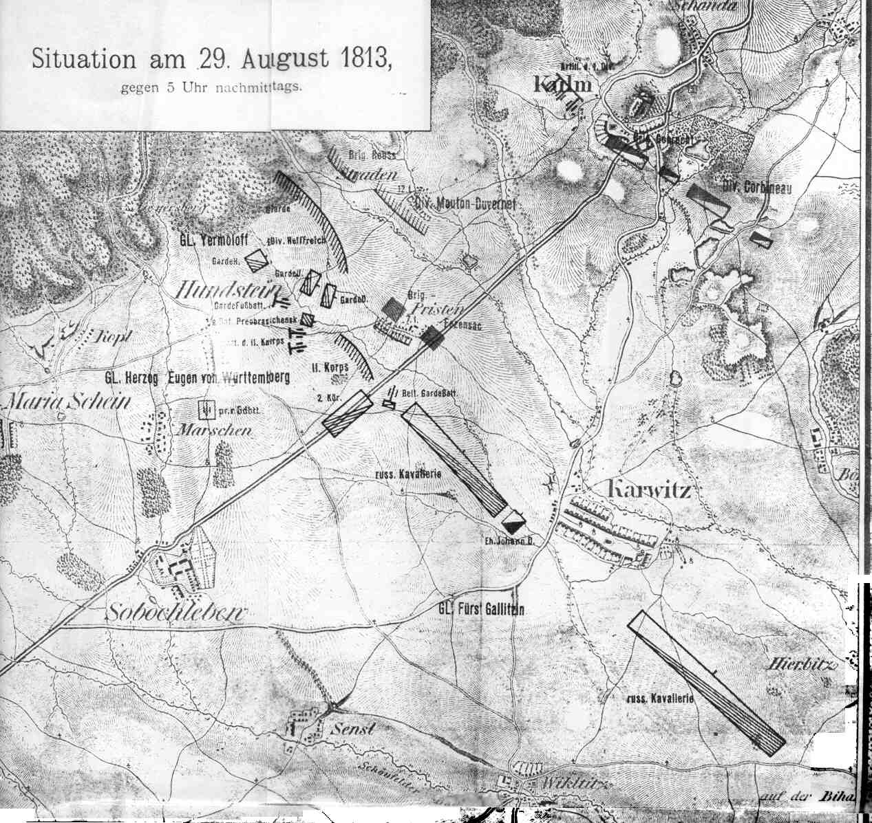 Vandamme had crossed the Elbe with 40,000 men, forcing the 12,500 men of Eugen of Württemberg back. They were reinforced by 26,000 troops under General Alexander Ostermann-Tolstoy, preventing Vandamme from threatening the Army of Bohemia’s flank.